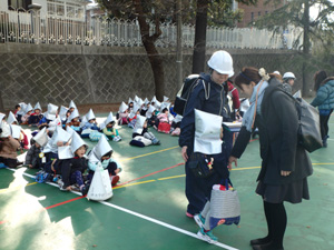 保護者参加の防災訓練を行います。各クラスに於いてかるた・コマまわし大会をし、表彰式を行います。